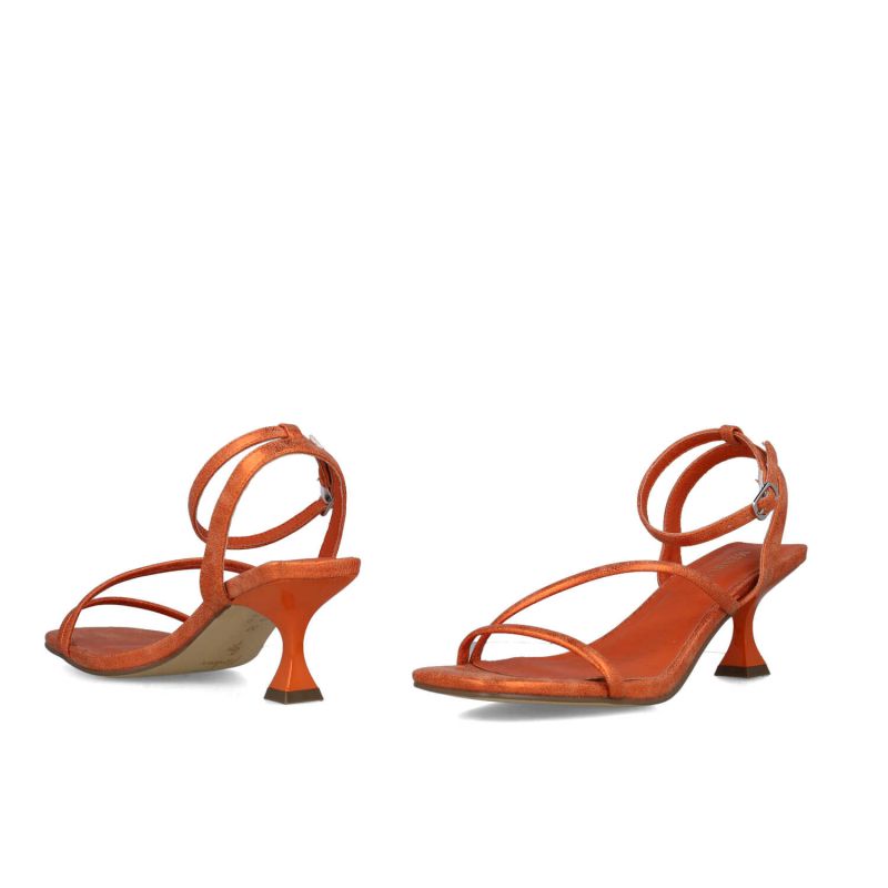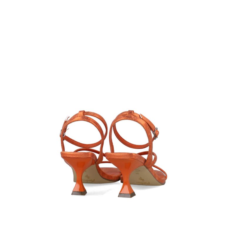 Light blue strappy high-heeled sandals featuring a shiny, metallic finish, cushioned soles.