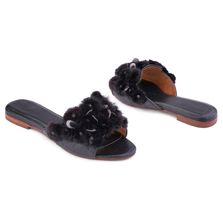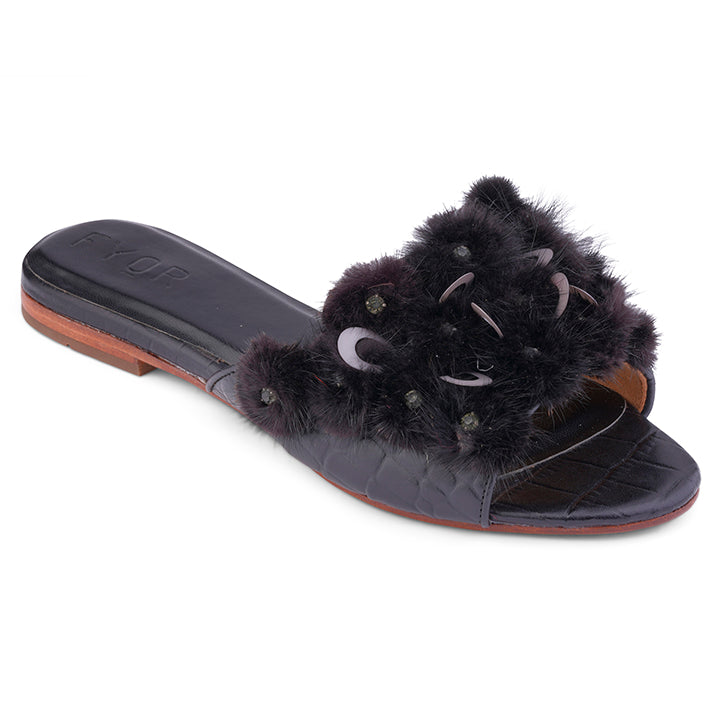 Stay well-dressed and stylish with FYORs slip-on slider sandals. Featuring an elegant lace design in Fur with sequence .