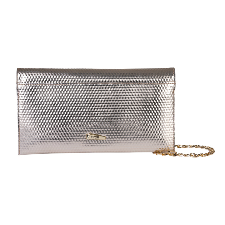 Turn heads with this dazzling metallic clutch featuring a textured finish and a compact silhouette—perfect for parties or evening outings.