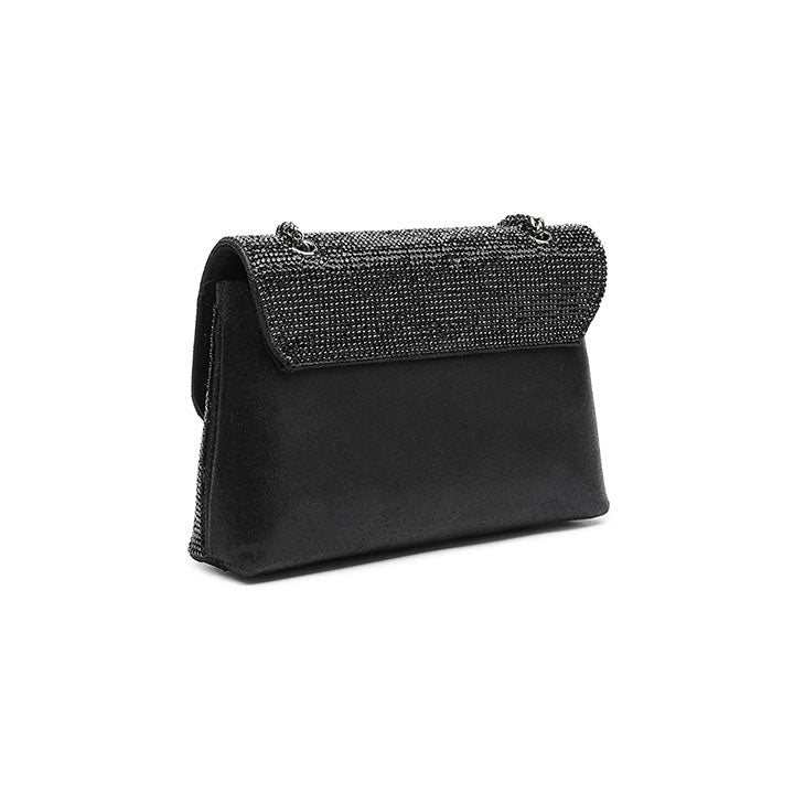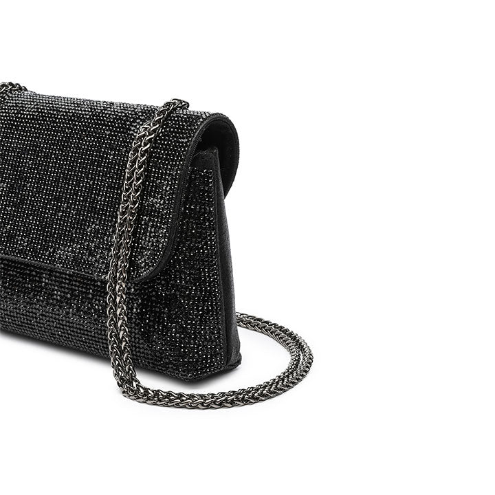 Meet our envelope evening bag adorned with crystal, a detachable metal-linked crossbody strap for a stylish touch.