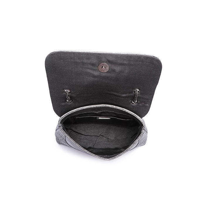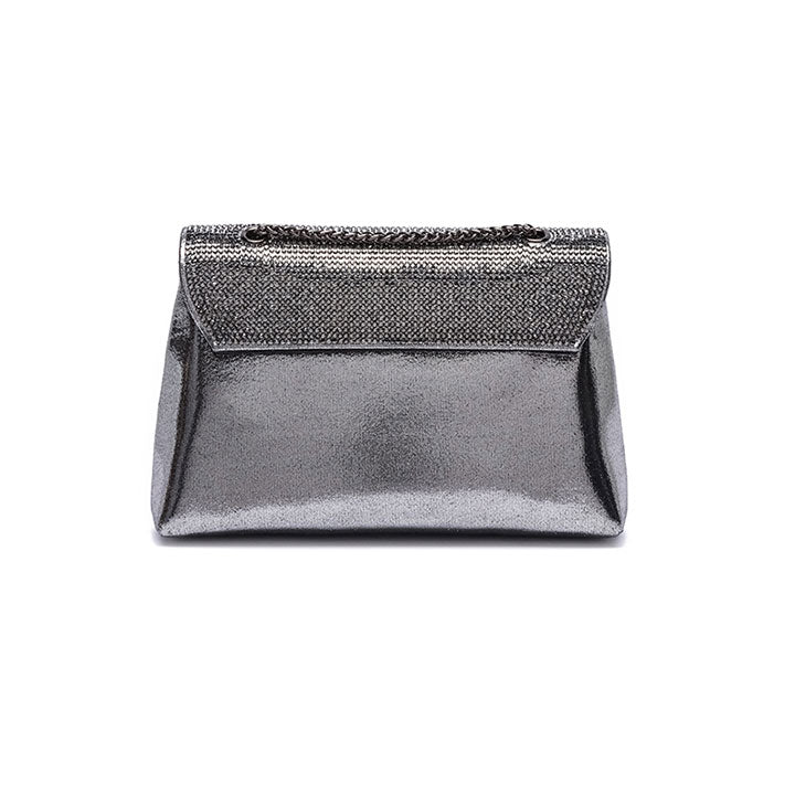 Meet our envelope evening bag adorned with crystal, a detachable metal-linked crossbody strap for a stylish touch.