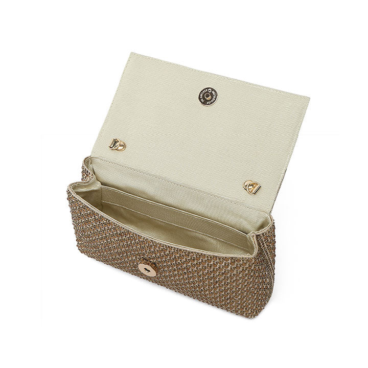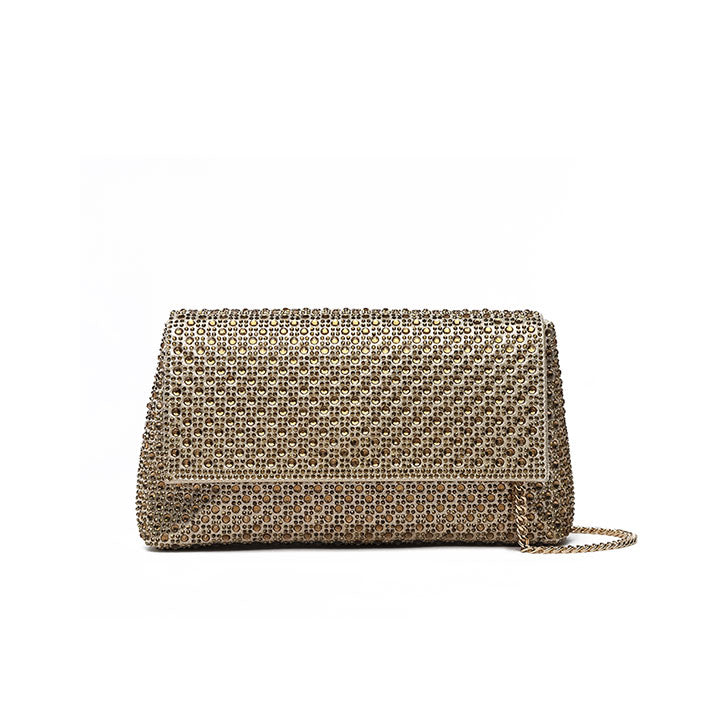 Exquisite crystal-embellished evening bag with a detachable metal-linked crossbody strap, perfect for adding a touch of elegance.