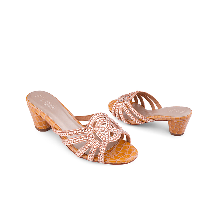 Embellished upper, genuine leather outsole, fully covered with premium leather, featuring a small cone heel.