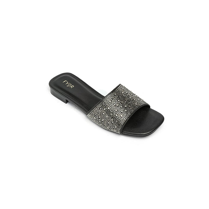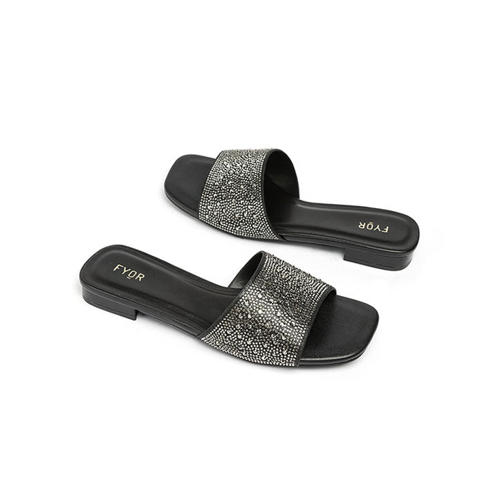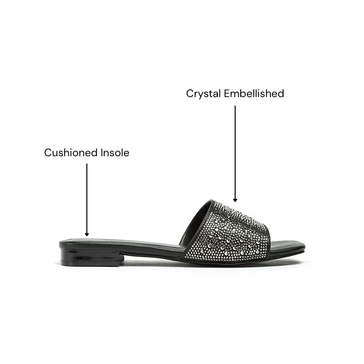 Iconic silhouette with premium leather and dazzeling crystals featuring cushioned sole and trendy flats