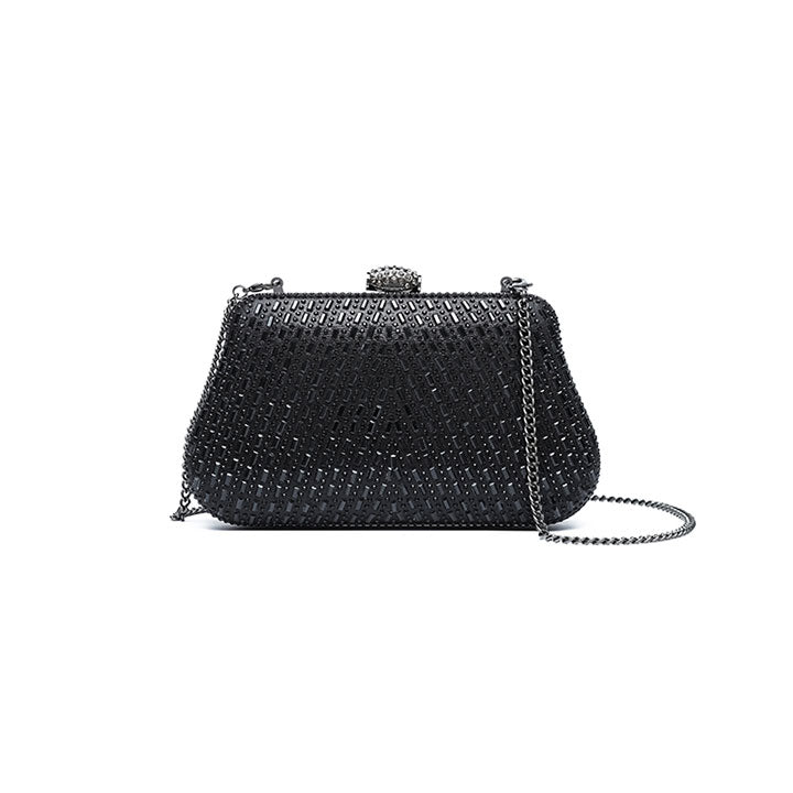 Champaign light gold sculpted evening bag embellished with jewel, featuring cross body strap for added charm.