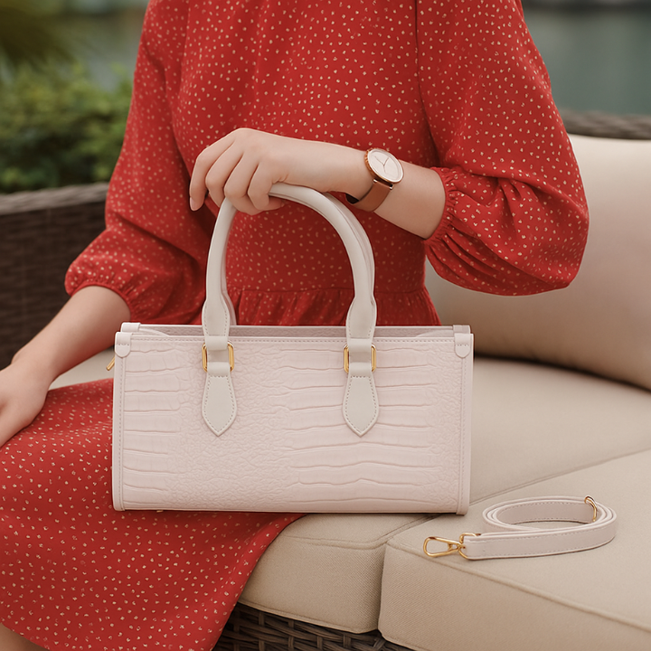Chic croc-textured handbag with gold accents, versatile carry options, and a spacious zippered interior.