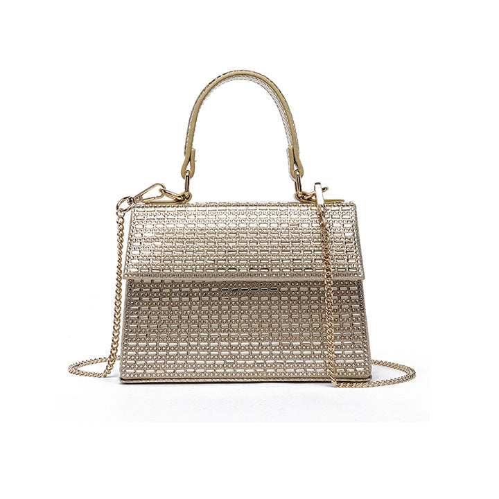 USP- Elegant evening bag adorned with crystals, featuring a detachable metal-linked crossbody strap for versatile styling