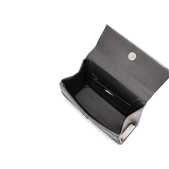 USP- Elegant evening bag adorned with crystals, featuring a detachable metal-linked crossbody strap for versatile styling
