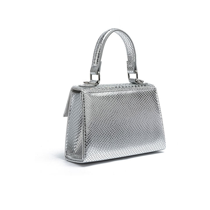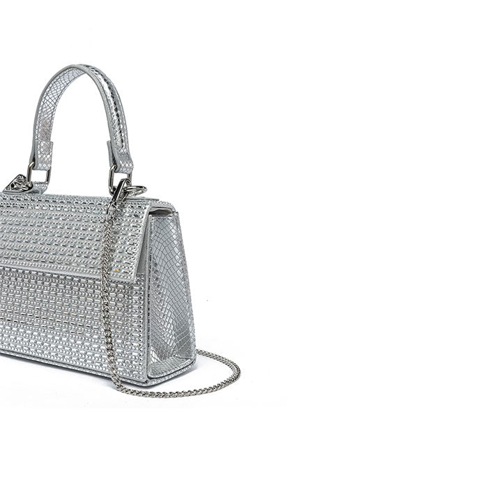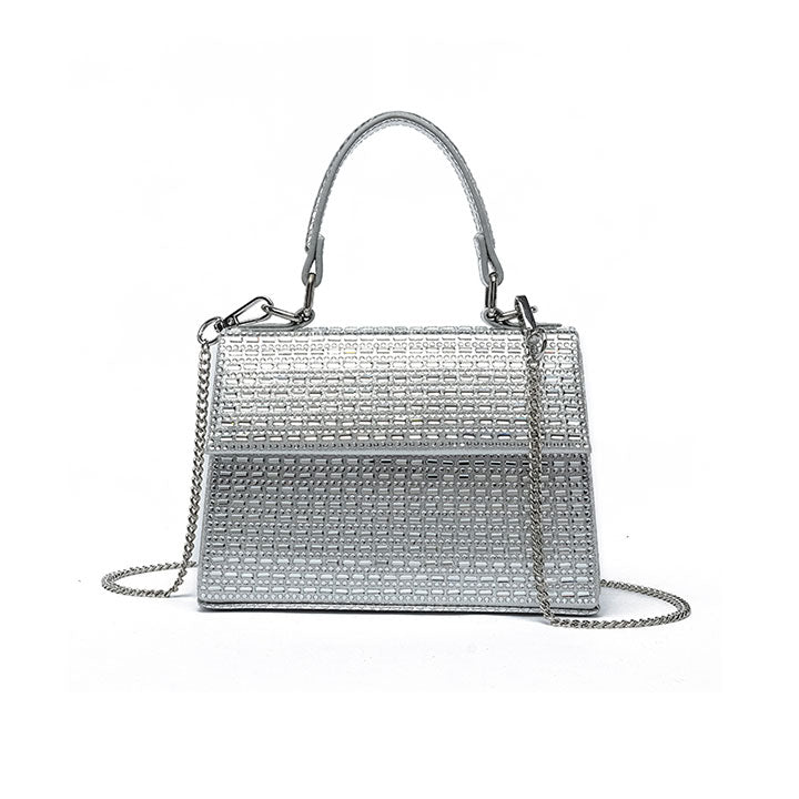 USP- Elegant evening bag adorned with crystals, featuring a detachable metal-linked crossbody strap for versatile styling