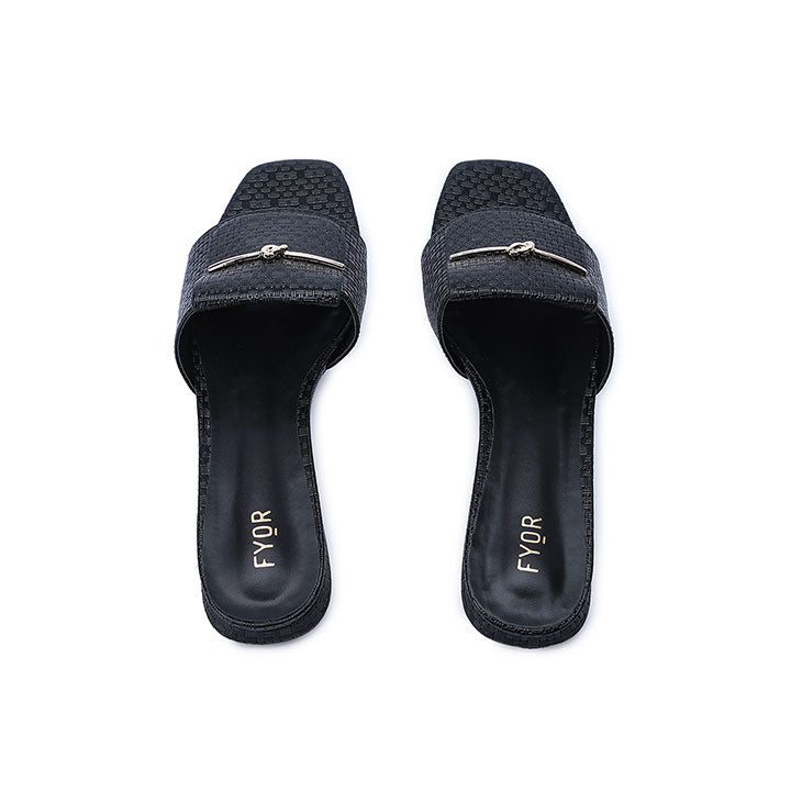 Square toe flat with shiny upper featuring mat design and a gold-plated brooch.