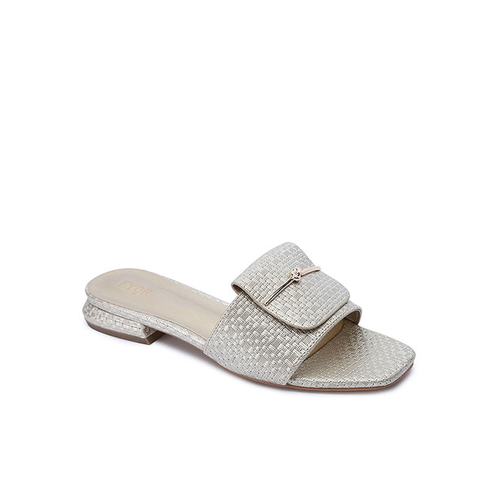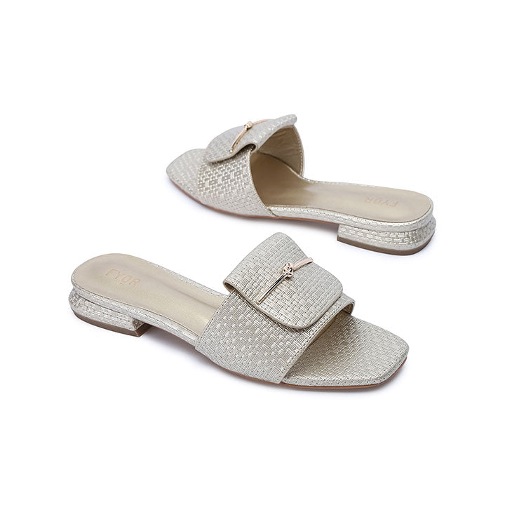 Square toe flat with shiny upper featuring mat design and a gold-plated brooch.