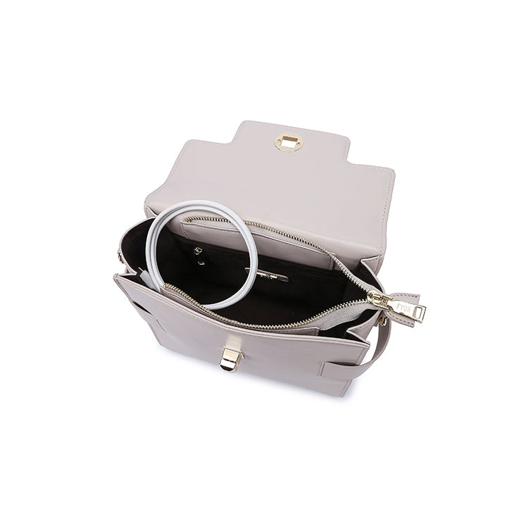 Presenting a box bag with braided top handle and wide straps dramatic design, with twist metallic lock, for every day wear.
