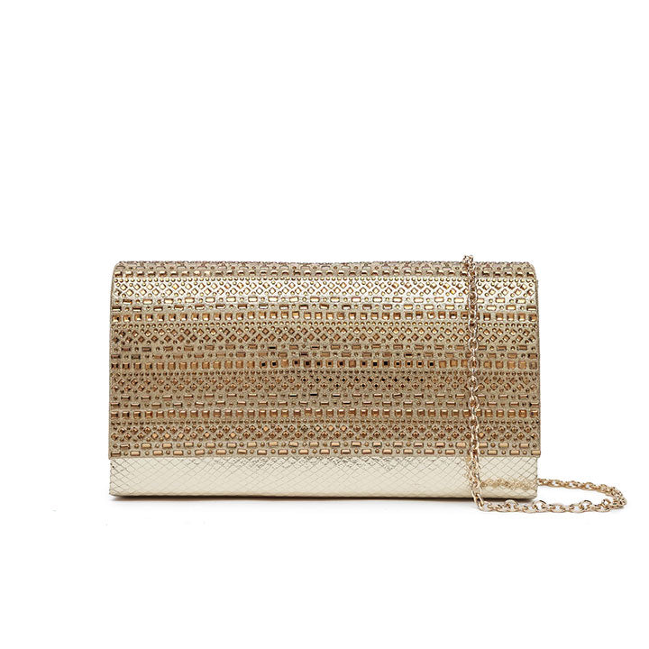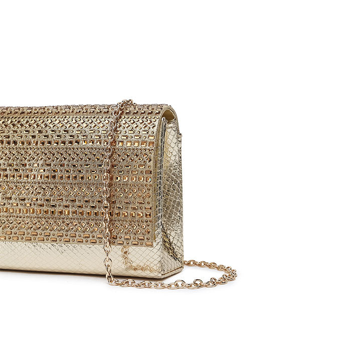 Timeless flap over evening clutch with metallic leather and handcrafted twinkling crystals detailings, featuring magnetic button closure.