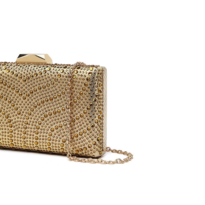 Enchanting edgy evening clutch adorned with hand-picked dazzeling crystals, featuring push lock frame closure and linked chain strap for a versatile look.