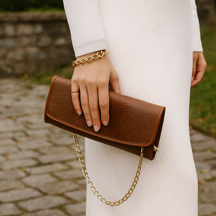 Chic and versatile, this grey clutch features a lizard-textured finish and a sleek silver chain. Compact yet spacious, it's perfect for evenings out or stylish day looks.