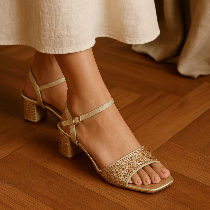 Timeless evening mule with metallic leather, vamp and block heel embellished with crystal, featuring ankle buckle strap.