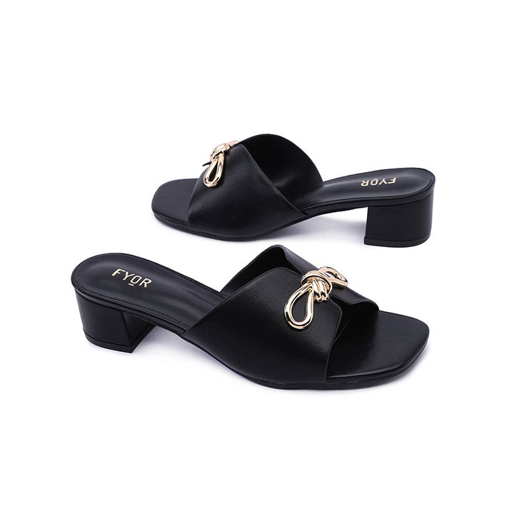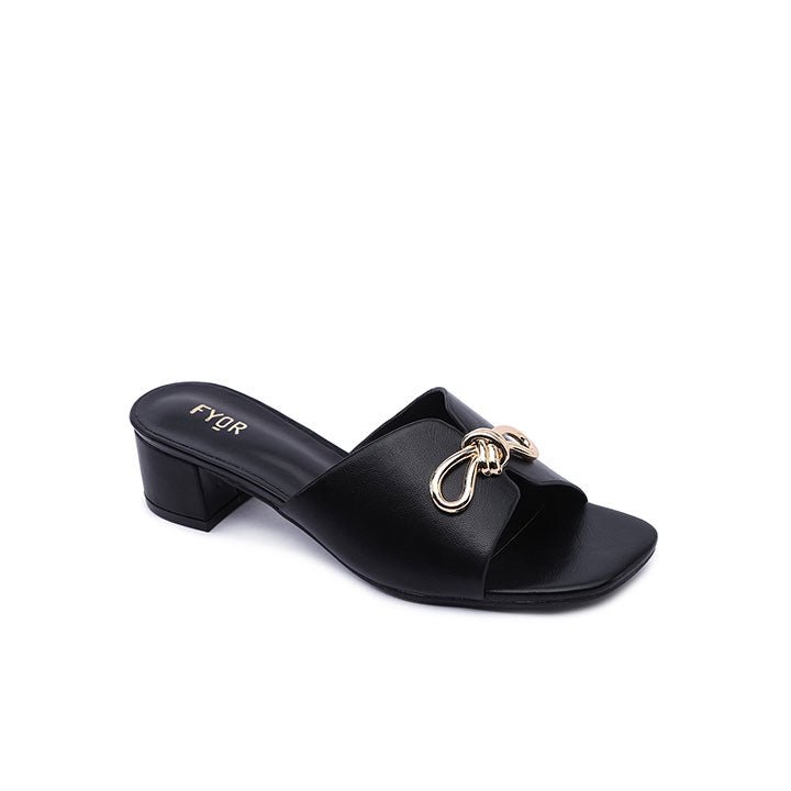 Meet our chic cozy mule with a metallic bow detailing, standing on a box heel.