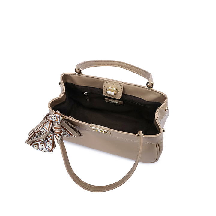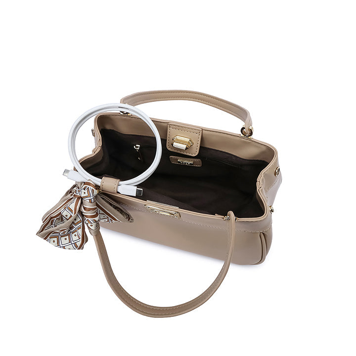 Timeless top handle with trendy design, featuring shoulder straps attached with metallic rings and gold plated twist lock closure.