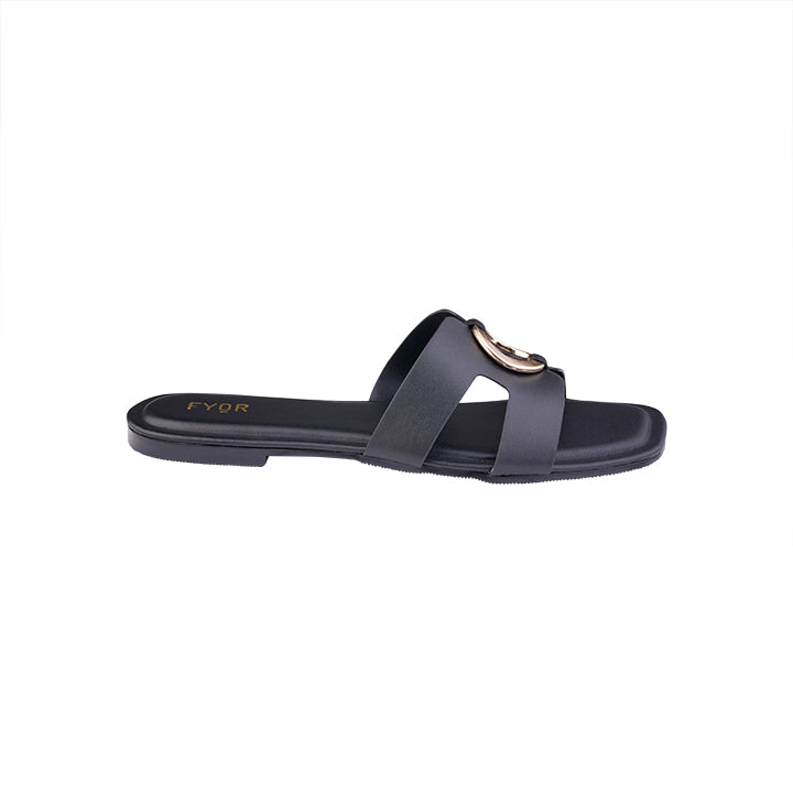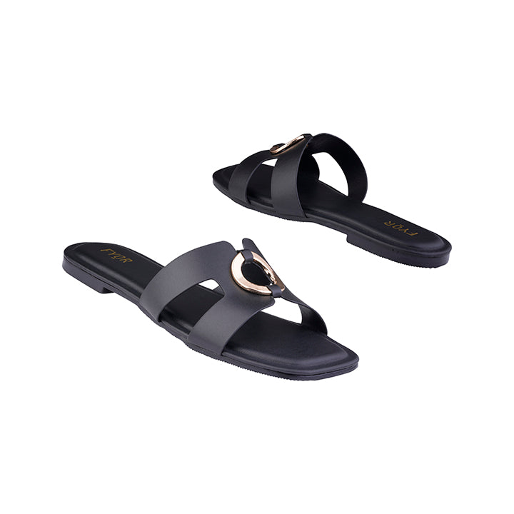• Design: Slip-on style with broad straps and metallic buckle detail