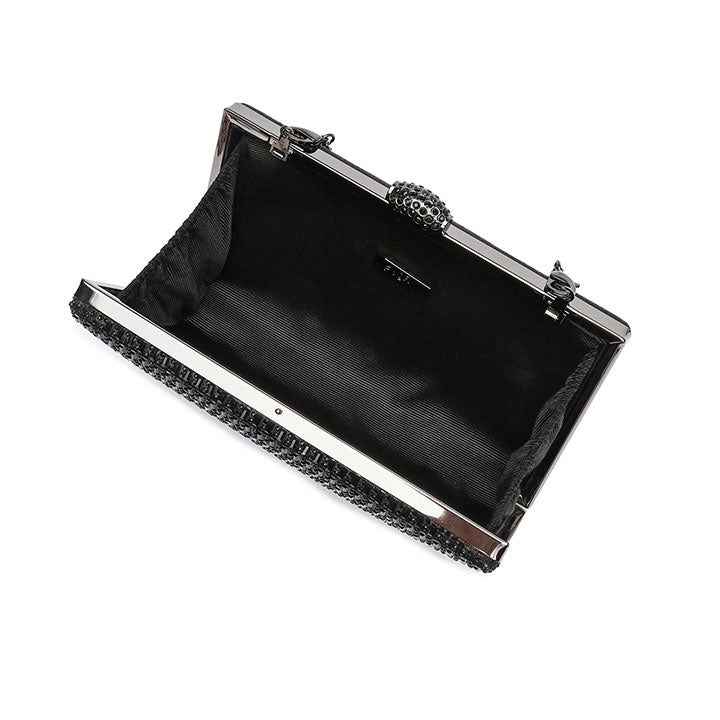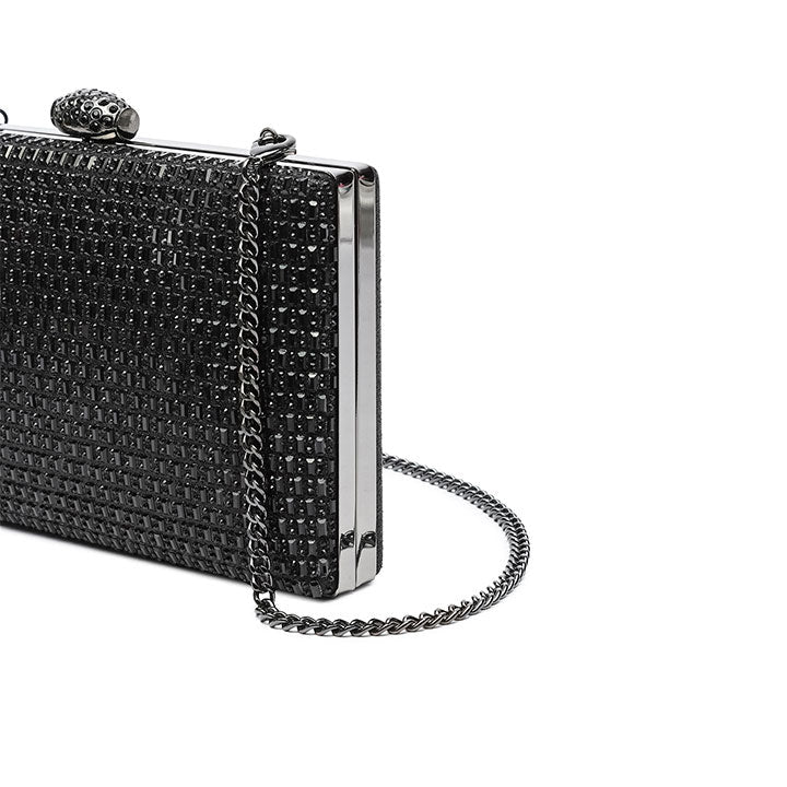 USP - Glamorous crystal-embellished evening bag with a detachable metal-linked crossbody strap for effortless elegance.