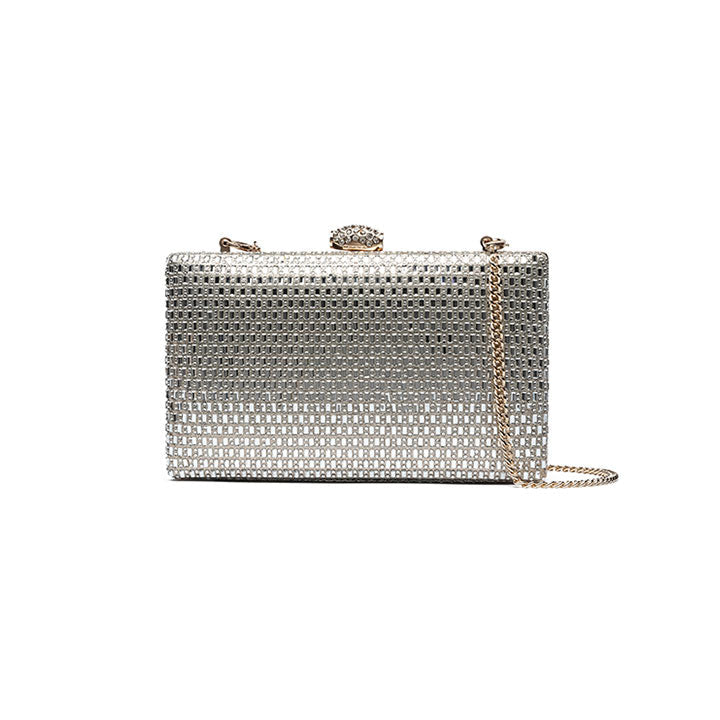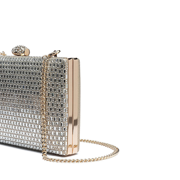 USP - Glamorous crystal-embellished evening bag with a detachable metal-linked crossbody strap for effortless elegance.