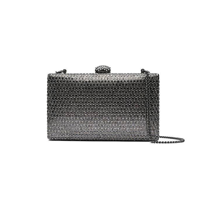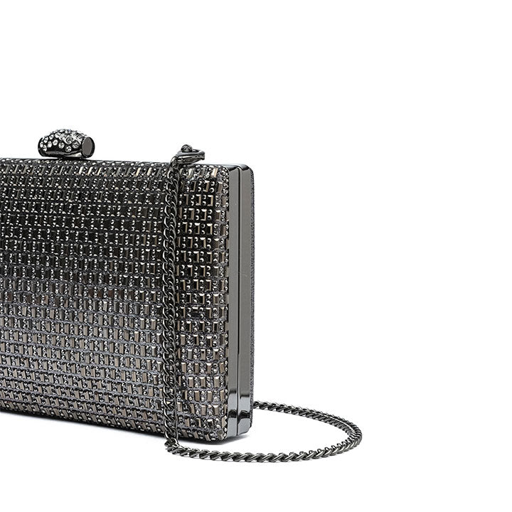 USP - Glamorous crystal-embellished evening bag with a detachable metal-linked crossbody strap for effortless elegance.